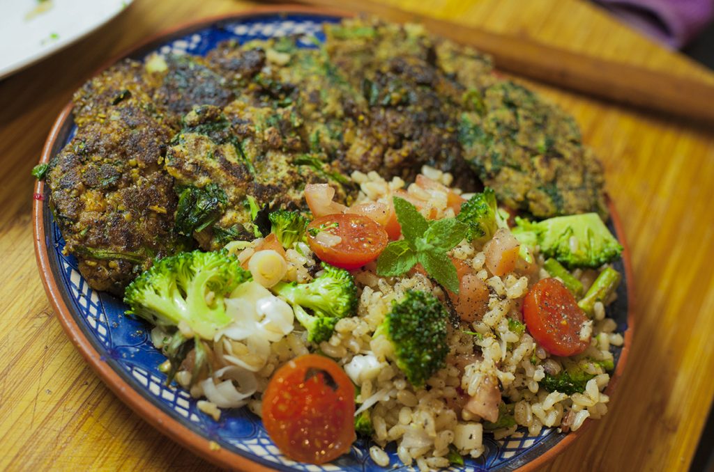Esta receta está inspirada en las crestas malagueñas. Son hamburguesitas de carne aderezadas con especias árabe y picantonas que se toman en barecitos pequeños. Le he dado una vuelta y las he convertido en vegetales. Lo acompaño con un arroz fresco al estilo del tabulé con algunos cambios.
