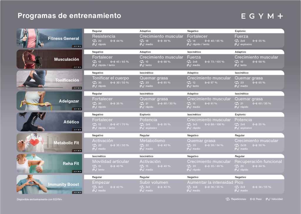 Estos programas de entrenamiento con los equipos Egym tienen diferentes tipos de estímulos con 4 fases de entrenamiento que realizan diferentes contracciones musculares para tener un resultado optimo.