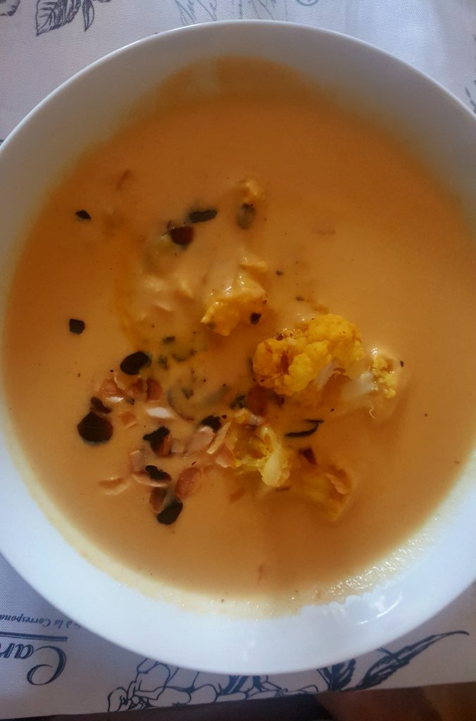 - Repartid la sopa en 6 platos, añada la coliflor cocinada al vapor previamente y espolvoreadlo con las almendras tostadas.